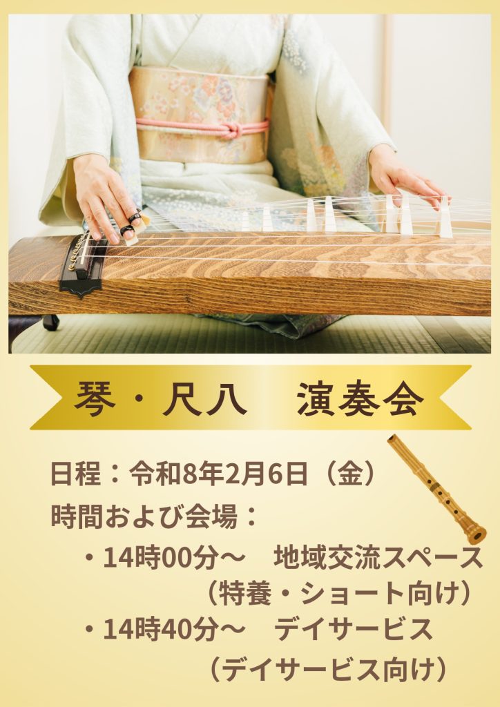 令和8年2月6日(金) 特養の入所者様、ショートステイのご利用者様、およびデイサービスのご利用者様を対象に、ボランティア様による琴・尺八演奏会を行います。ぜひ、この機会に琴・尺八のすばらしい音色を感じてください。きっと、貴重な体験ができると思います。