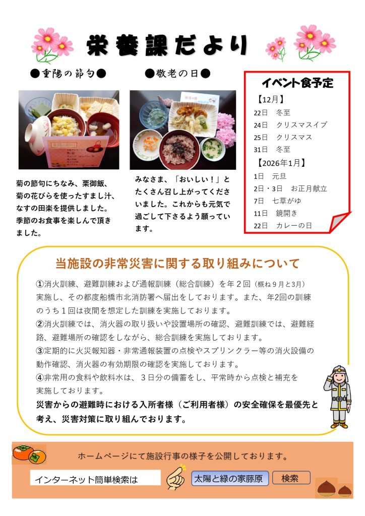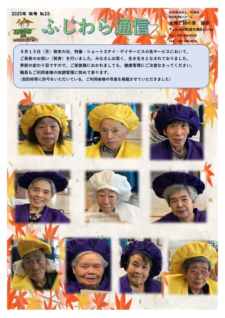 ふじわら通信(秋号)が完成いたしました。今月号は、敬老会の様子を掲載させていただきました。あわせて、当施設の非常災害に関する取り組みも掲載しております。