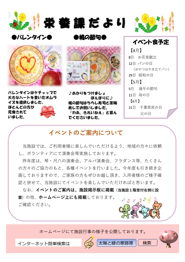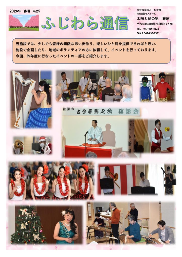 太陽と緑の家藤原の施設広報誌(ふじわら通信)春号が完成しました。今回、イベントのご案内とお食事について掲載いたしました。ご覧になってください。