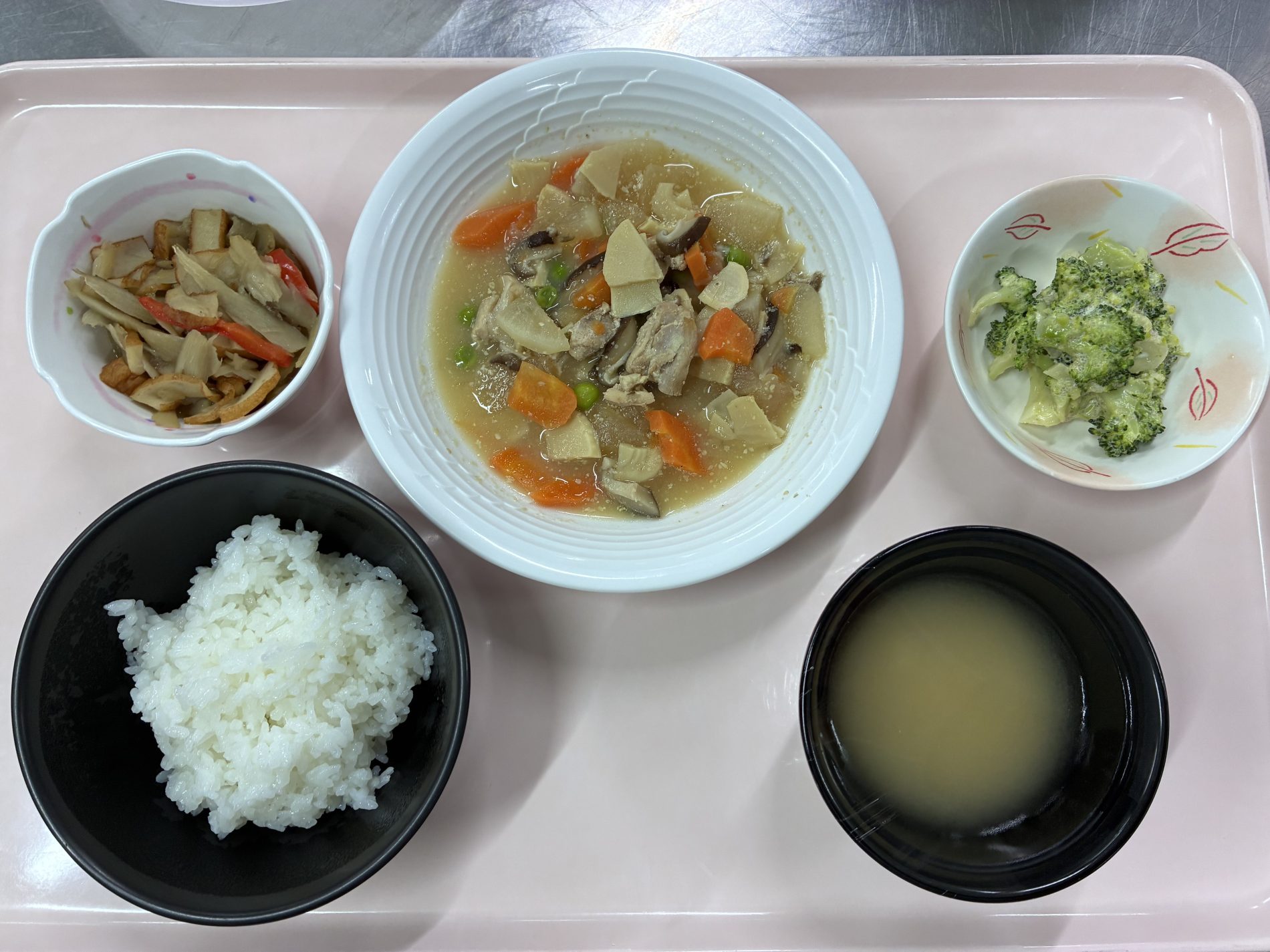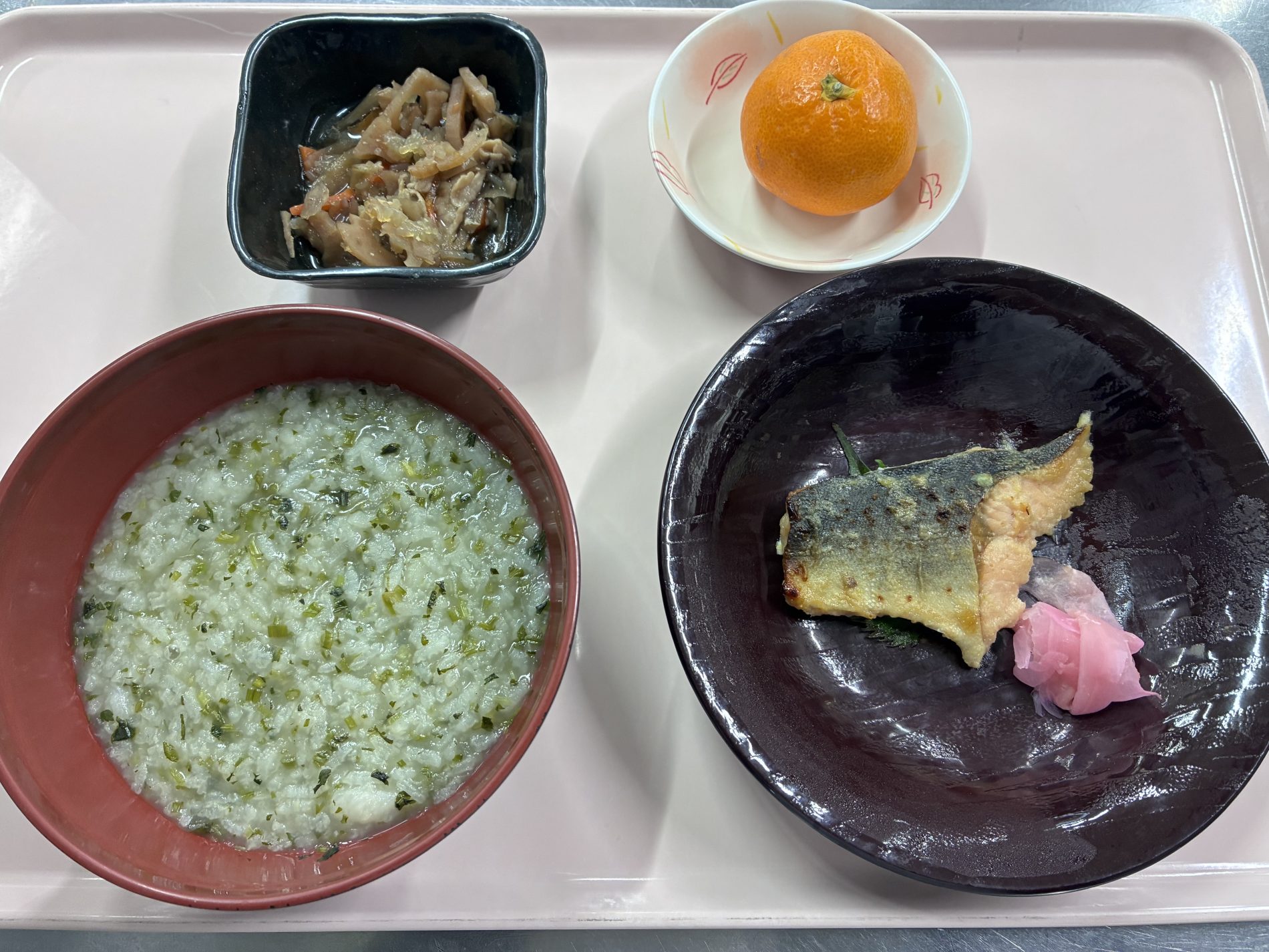 令和8年1月7日 七草がゆを提供させていただきました。併せて鱒のねぎ味噌焼き、当座煮、フルーツ(みかん)を添えさせて頂きました。