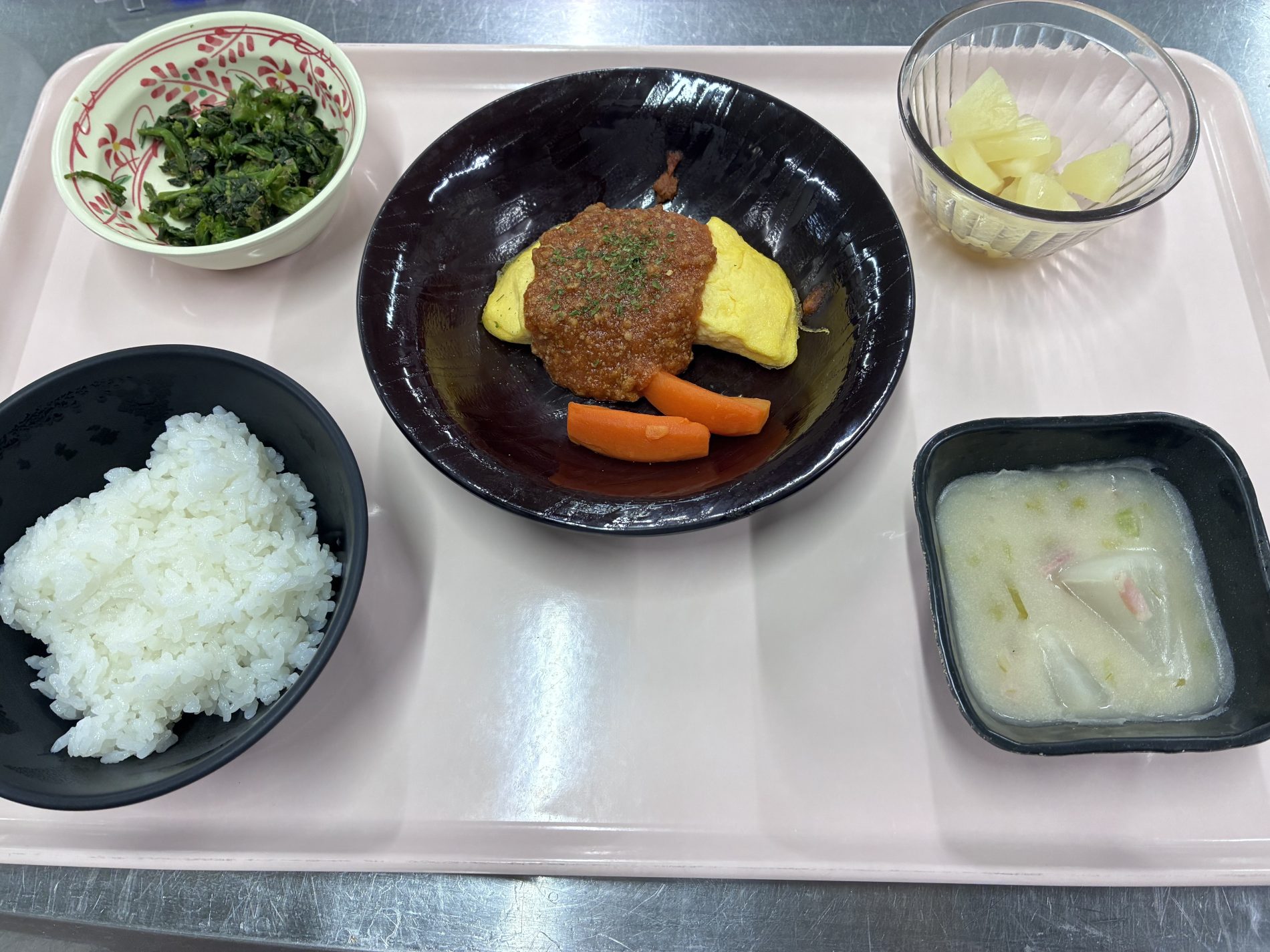 1月9日 昼食 ごはんにオムレツミートソース掛け、かぶのクリーム煮、菜の花のおかか和え、フルーツ(パイン)をご用意させて頂きました。