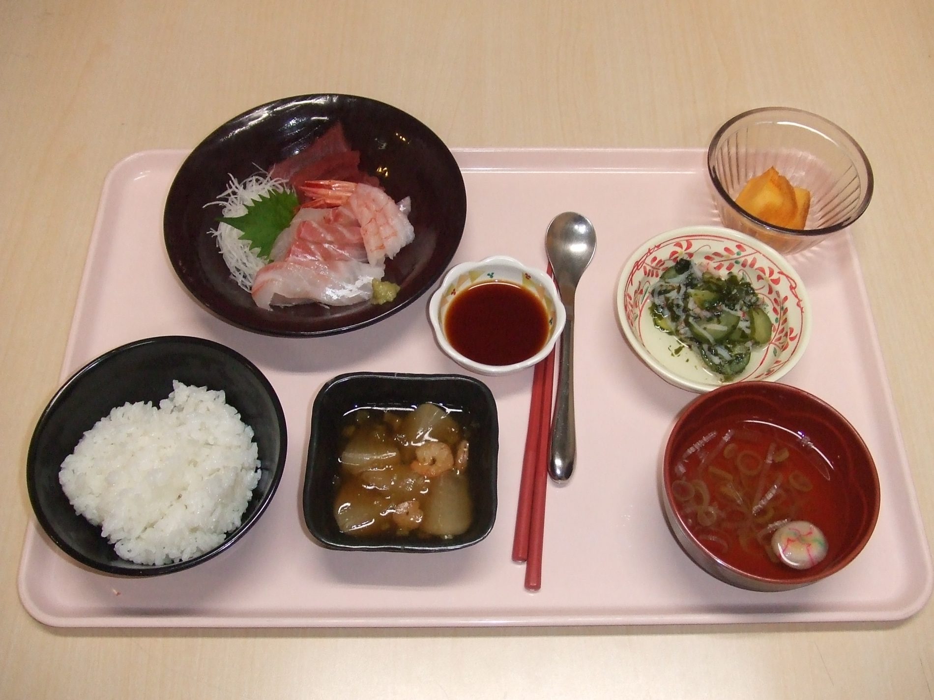 11月18日 月に1度の誕生日会(お昼)のメニュー お刺身とカブとエビの煮物です。