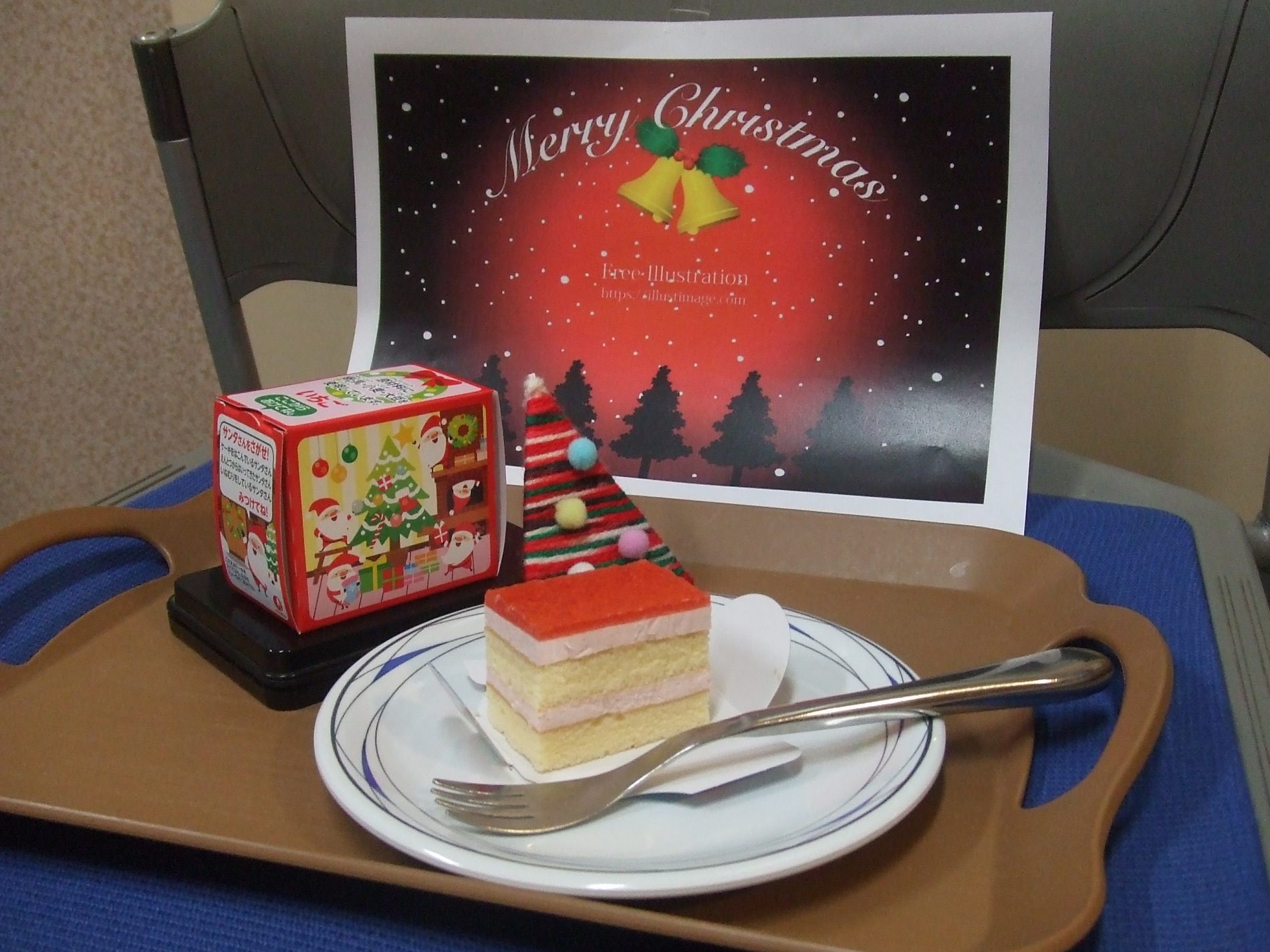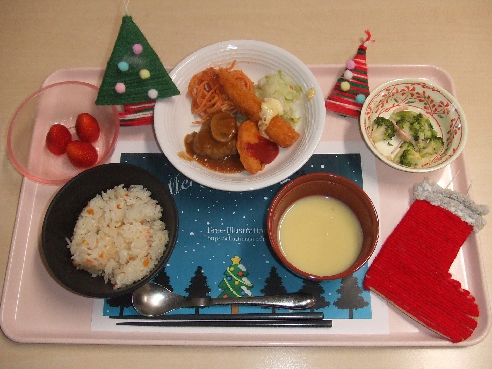 12月25日 本日の昼食はエビピラフ、ミックスフライ、コーンスープでした。おやつにケーキがついてきました。