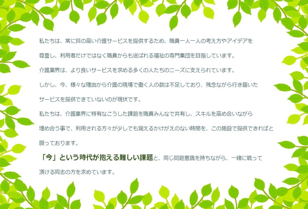 平成18年(2006年)に開設。来年20歳を迎えます。上越市の中でも介護老人保健施設として知識の蓄積もあります。年間休日は126日。プライベートも仕事も充実させることができます。まず見学して施設やスタッフ間の雰囲気を感じてください。ご連絡をお待ちしています。  事務課長  青木 聡