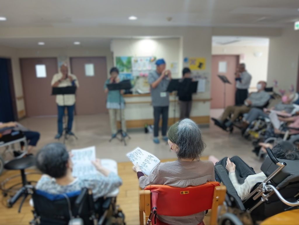 。今回は特養入所者様対象で各フロア毎に3回に分けて演奏下さいました。特に3階は約2ケ月振りの演奏会で大きな声が響き渡りました。